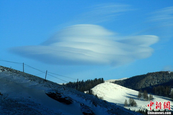 新疆哈密北部的天山上空出現不明飛行物體?其實這是與UFO飛常相似的「飛碟雲」。中新社報導,受到冷空氣影響,最近3天以來,哈密降雪降溫,雪後的天山就出現這樣的奇特景觀。