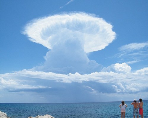 另外,一名攝影愛好者在希臘米克諾斯島拍到一朵蘑菇雲,像極了1940至1950年代的核爆測試現場,而其實,這也是砧狀積雨雲而已。