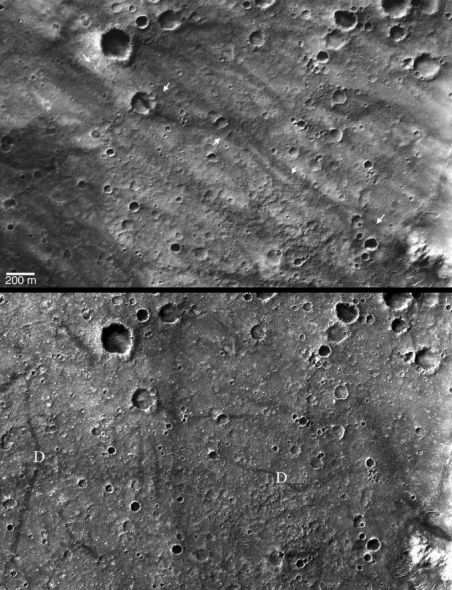 自2004年在古謝夫環形山著陸以來,“勇氣”號探測器的一舉一動便被火星軌道上的其他探測器所監視。雖然“勇氣”號的車輪寬度剛剛超過6英寸(約合15釐米),但在2004年初火星環球勘測者拍攝的照片上,“勇氣”號著陸地周圍的車轍(箭頭標出的地方)清晰可見。然而,當天文學家再次研究火星勘測軌道飛行器HiRISE相機拍攝的相同區域的照片時,這些痕跡卻完全消失。有些被塵暴痕跡(下圖標“D”的地方)所取代。2006年晚些時候,在火星環球勘測者因故障與地面失去聯係以後,火星勘測軌道飛行器就取代了它的位置。