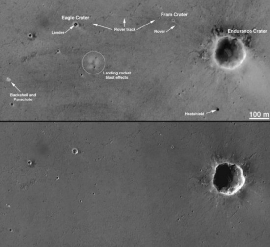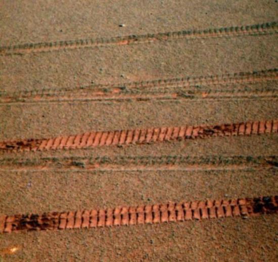 在此過程中,我們可以看到“機遇”號的車轍痕跡,而根據HiRISE相機自2009年中拍攝的照片,這些痕跡仍清晰可見。蓋斯勒和同事認為,之所以出現這種狀況,是因為“機遇”號在活動期間,將黑色的赤鐵礦石推到了下面的土壤中,令車轍痕跡看上去比周圍更難填滿、覆蓋赤鐵礦石的地區更顯眼。蓋斯勒説:“沙層很容易就被吹走或被取代,而取代赤鐵礦石則不那麼容易。據我猜測,那些車轍痕跡雖然越來越不明顯,但仍能看到,直至承受更多侵蝕,那些赤鐵礦石完全消失。”