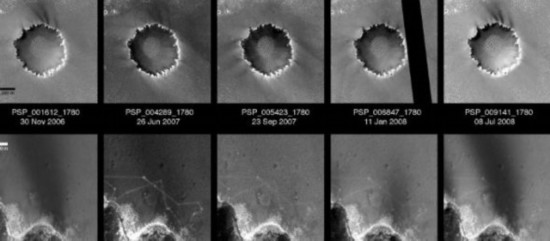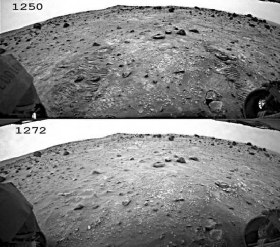 2007年7月,一場波及整個火星的塵暴充分展示了火星大風的破壞力。在等待塵暴消失以前,“勇氣”號探測器在大概相當於地球上一個月的時間裏一動不動,期間,利用安裝在後面的相機拍攝了這些照片。由於風力過大,“勇氣”號的相機被灰塵所覆蓋。在最上面的那張圖,“勇氣”號的車轍痕跡非常清晰,但在22個火星日過去以後,它們被完全抹去,取而代之的是從別處吹過來的土壤。