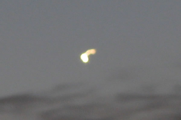 照片中的不明飛行物體,應是飛機沒錯,在傍晚的時間,地面可能已經無陽光照射,但在飛機的高度仍然可以接觸到陽光,飛機實際是在飛行的,但因與拍攝者的距離很遠,因此感覺移動數度很慢,甚至覺得沒在移動,而亮點的部分則是太陽光反射導致。