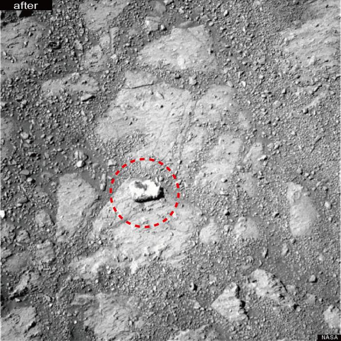研究人員真的被火星上的一些神祕怪石搞迷糊了!最近從機會號火星探測器拍到的照片發現,這個石頭似乎是無中生有的出現在哪兒,因為近兩個星期前,並未拍到它出現在那裡!怪哉!有人移動了它?