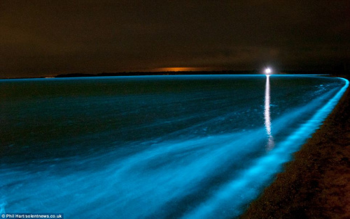 報道稱,這種熒光是由一種被稱為“生物體發光”(bioluminescence)的化學反應引起的,一旦生活在湖水中的微生物夜光藻(Noctiluca Scintillans)受到外界“干擾”,它們就會做出自然反應,發出亮光。但是通常,亮光不會如此明顯,甚至人們也不會注意到。但是,這個湖中夜光微生物的密度遠遠高出其他湖,因此形成了這種特有的現象。