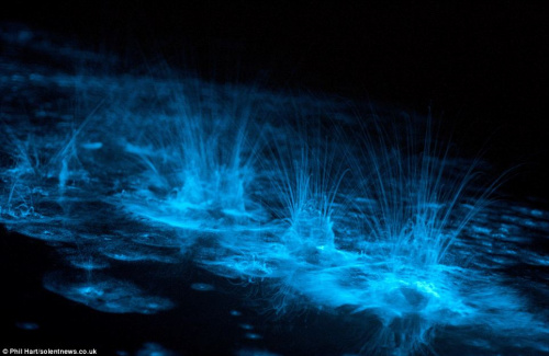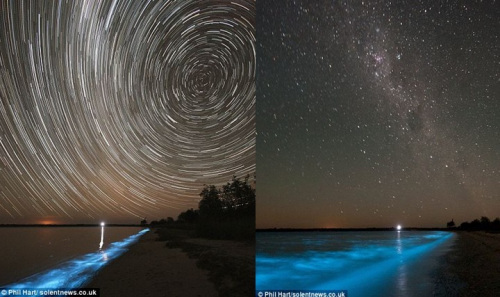 為了拍到更美的照片,哈特將相機快門調到很慢的速度,不斷朝湖中投擲石子和沙,盡可能激發最多的微生物發出奇異的藍光。