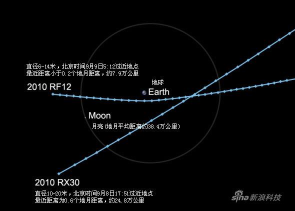 2010 RX30小行星距離地球最近時僅相距15.41萬英裏(約合24.8萬公裏),即相當于地月距離的60%。另一顆編號為2010 RF12的小行星,于北京時間9月9日淩晨5時12分,以4.9萬英裏(相當于地月距離的20%)的距離掠過地球。(楊孝文)