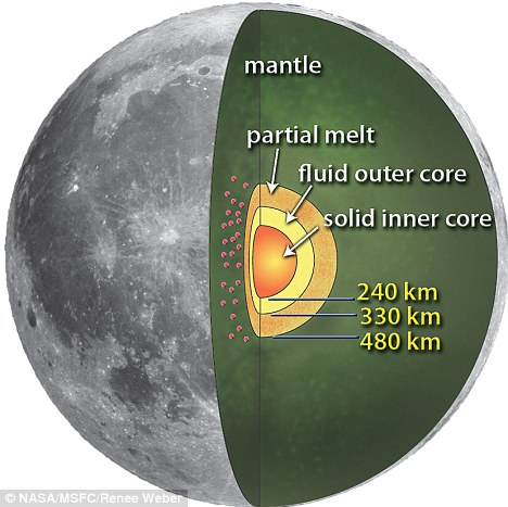 借助當今美國最先進的太空科學技術,美國宇航局的科學家應用現代地震學技術對40年前月震感測器勘測數據進行了再分析,這項最新研究揭示了月球的神秘內部結構,最核心部分是一個固態富鐵內核,其直徑約241.4公里(150英里),其外部是一個直徑約330公里(205英里)的液態鐵核外層結構包裹著。