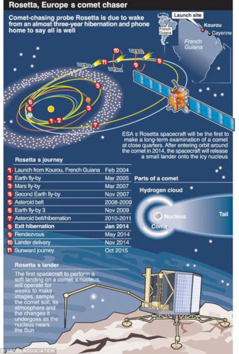 歐洲太空總署(ESA)10年前發射的彗星探測船「羅塞塔」(Rosetta)在沉睡31個月後,按照計畫甦醒備進行史無前例的彗星探索任務,也是人類史上首次有人造飛行器登陸彗星的壯舉。