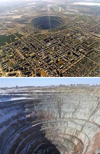 雖說「地球坑洞是出於上帝的憤怒」,但世界上最大的「洞」(hole),實際上是由人類的貪婪所鑿出來的;俄羅斯西伯利亞的永凍土帶附近,有個巨大的鑽石礦「和平鑽坑」(Mirny Diamond Mine),它的直徑達1600公尺,深度有533公尺。傳聞說,和平鑽坑因規模太大,會產生強力的氣流,只要直升機經過上空,就會被吸入洞中。