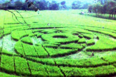 當地村民23日在村子附近的稻田中發現一個由倒伏的稻株和完好稻株共同構成的複雜圖案。圖案總體呈圓形,直徑約為70米,內部由規則的環形、扇形及一些不規則圖形組成。