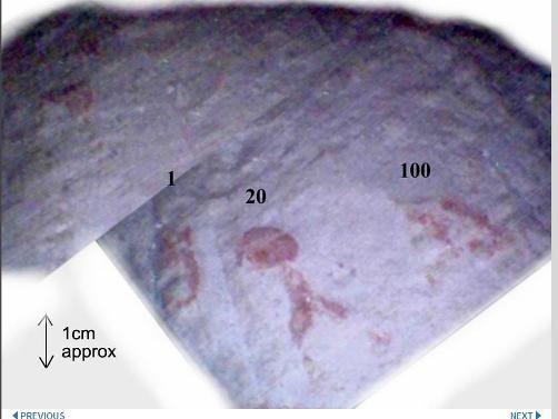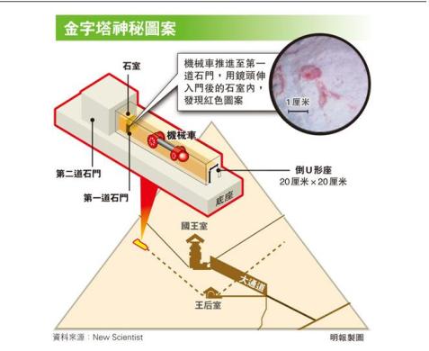 因為密道窄小,因此勘查困難,來自香港的探險家伍士銓與他的團隊帶著小型機械車,上面裝了可轉彎的鏡頭,穿越長、寬20公分的狹小密道,終於把4500年從未曝光的紅色字跡展現在世人面前。