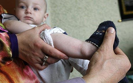 看這名嬰兒。阿裏的母親馬季納·雅庫波娃對記者說,孩子腿上的經文