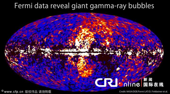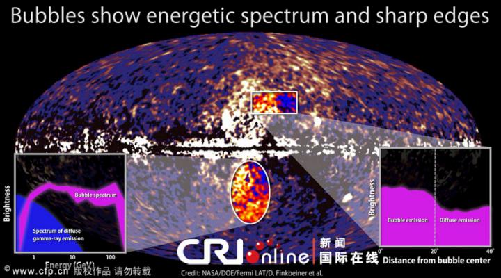 2010年11月11日消息,據美國太空網報道,科學家日前最新探測發現銀河系中心溢出高能量放射線形成的兩個巨大氣泡,並認為這兩個巨大的氣泡源自一個超大品質黑洞的噴發。每個神秘的宇宙氣泡結構直徑跨越25000光年,兩個氣泡連接起來可覆蓋可見夜空一半的區域,它們噴射著伽馬射線(高能量波長光線)。