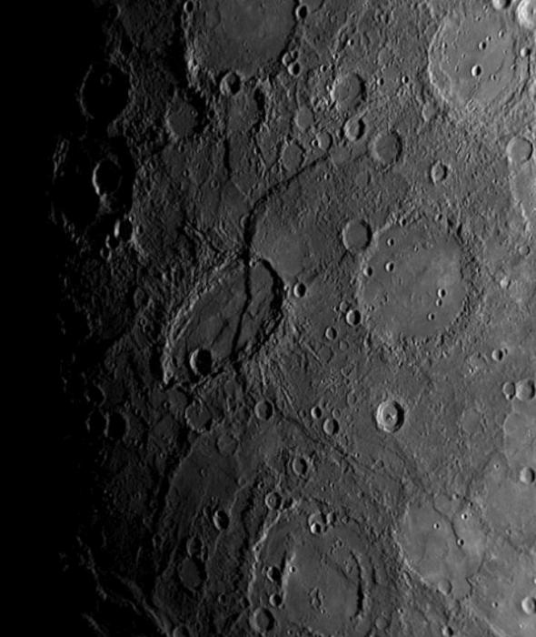 水星是距離太陽最近的行星,地表被逆衝懸崖覆蓋。逆衝懸崖是一種階梯式地貌,由火星收縮所致。在這幅照片的中部,一個彎曲的懸崖清晰可見。逆衝懸崖分佈在水星表面各處,說明整顆星球都在收縮。從誕生到現在,火星直徑因核心冷卻可能已經萎縮了6公里。這一過程可能仍在持續中。最近的觀測結果顯示,地球的衛星月球可能在不久前也以類似的機制發生萎縮,只不過程度上更小。