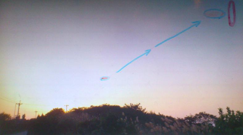 (最後瞬間消失前看到碟形飛行物的大小,大約將1顆50cm的球放到4m處看到的大小!另從看到到消失,碟形飛行物從我們前方距離大約300m處,飛行至我們前方距離大約50m處空中後消失!)