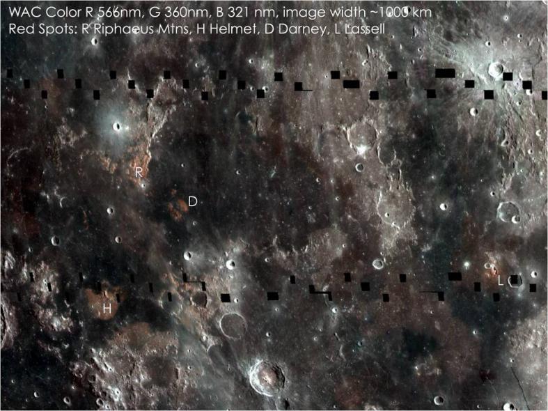 美國亞利桑那州立大學學者馬克‧魯賓遜和約翰斯‧霍普金斯大學學者布雷特‧德內維借助分析美國月球勘測軌道飛行器傳回的資料,得出一幅由黑色、藍色、綠色和紅色構成的月球表面圖片。