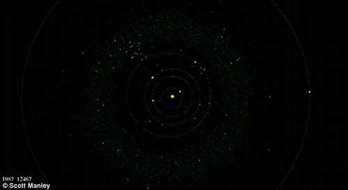 這段彩色視頻顯示,伴隨著望遠鏡技術的提高,我們發現越來越多的小行星逐漸接近地球。視頻顯示了在過去30年裏發現的每一顆小行星,它們使太陽系越來越緊密。
