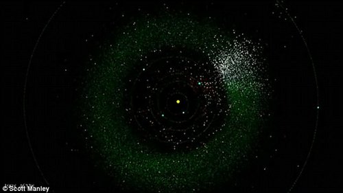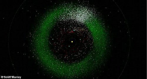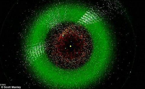 圖像中是以色彩區分接近太陽系內部的程度,最中心的黃色亮點是太陽。據悉,曼利通過望遠鏡將1980年至2010年間每一天觀測的小行星數量變化記錄在這張“地圖”中。30年前,太陽系內發現8954顆小行星,現今共發現530091顆小行星,多數位於圖像的綠色區域。