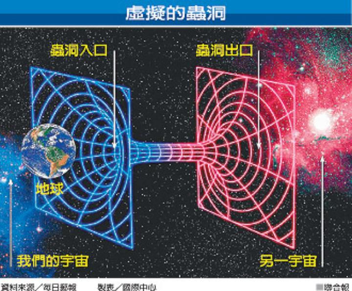 也可以拿一張紙做實驗。把這張紙彎曲對折,先在一端上打一個洞,再把另一端打一個洞,把這兩個洞疊合形成的孔道,也是蟲洞的概念。