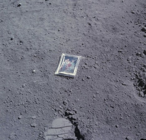 阿波羅16號太空人杜克(Charlie Duke)在執行第三次、同時也是最後一次登月任務時,搭乘月表勘查車前往笛卡兒高地(Descartes Highlands);他將一小張全家福照片放在地上,紀念性地拍了幾張照片,而這張即為其中之一。