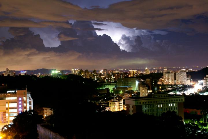 20120724 7:30pm:整晚近三小時於台北盆地西邊林口台地的上方天空中大片白雲烏雲密佈,不斷的閃電雷光大作蔚為奇景,不定型的白雲摻雜著烏雲被電光任意塗抹,達數小時之久,天空不斷景像奇異、瑰麗且詭譎。上演著大自然閃電秀,只是完全沒聽到雷聲嘖嘖稱奇!