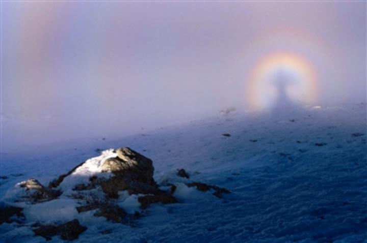 當然,照片中的側影並非鬼影。專業人士解讀說,這只是一種特別的光學現象。當一個人站在山上高海拔的地方,他的影子會被投射到身後較低海拔的雲層上,從而產生這種現象。人影周圍形成了像彩虹一樣的彩色光環,這是由水滴的光衍射形成的。