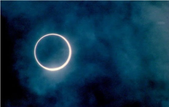日環食發生時太陽中心黑暗,邊緣明亮,形成光環,這是因為月球在太陽和地球之間,但是距離地球較遠,不能完全遮住太陽而形成。