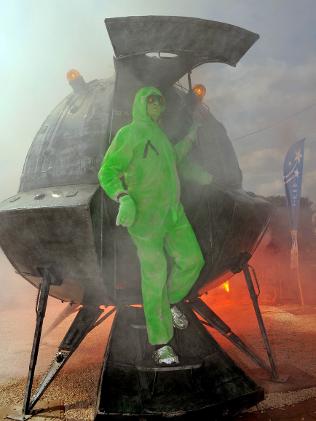 為了給“害羞”的外星人作出示范,當地人舉辦了一場模擬“第三類接觸”儀式:一架由當地藝術家設計制造的“飛碟”降落在UFO機場,當艙門打開,化粧成外星“小綠人”的表演者走下舷梯,踏上地球土地,成為34年來這裏的首批“外星來客”。