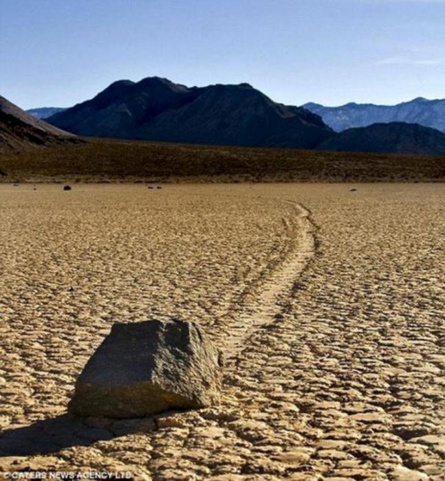 石的神秘移動狀況,在他拍攝的圖片中這些岩石的移動軌跡呈直線,未