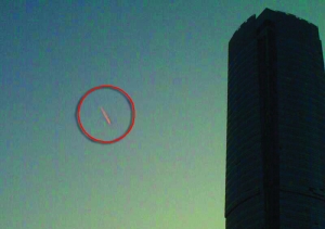 网友“狂欢者丙”6点半在新街口,偶然抬头发现一道霞光。“形似陨石,但以弧形轨迹降落。”网友“king141242”则描述自己在6点多从鼓楼苏粮大厦出来,无意中看到珠江路上空有个“飞行器”,由南往北,速度不是很快,但尾巴是很鲜艳的橘红色。网友“叶落秋分”在河西庐山路边用相机也捕捉到了这个不明飞行物。