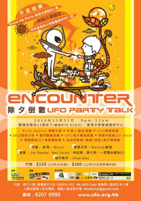 【2010年11月1日】繼去年「2012 星人倒數 Party Talk 09’」後,港人今年繼續引爆UFO派對熱潮,12月31日在香港中華書畫藝術中心舉行「ENCOUNTER!除夕倒數UFO Party Talk」,資訊娛樂並重,勢必成為今年除夕夜熱點。潮爆節目包括:UFO外星勁歌首演、前衛銀河話劇、得獎外星裝Catwalk、UFO短片賽頒獎禮、為地球默想、亞米動畫版點播、天外天飲宴、星人倒數舞… 大會更邀請全能音樂人Alice Amu 作曲填詞,親自獻唱外星歌,以音樂貫穿地球與外星文明!