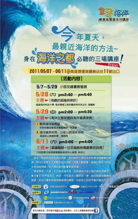 台灣四面環海,不論在歷史發展與文化生活上都與海洋密不可分,特別是擁有台灣最大港的高雄,由海洋孕育今日的繁盛,因此高雄亦以「海洋之都」聞名。今年3月日本東北大地震引發的海嘯與海洋汙染問題,讓台灣同感震撼與恐懼,隨著6月8日「世界海洋日」(World Oceans Day)將至,「海洋之都」高雄將於5/28(六)、5/29(日)、6/11(六)於美麗島會廊舉辦三場海洋系列講座,延伸日本地震帶來的後續效應,專家學者將與民眾分享海嘯、輻射以及海洋生態與資源等相關資訊,讓您獲得最正確的訊息,這是身在「海洋之都」絕對不能錯過的講座!