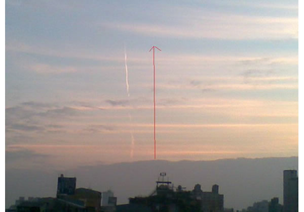 站長說明:據方先生說,當時目擊兩個火球,其中一個帶有2個凝結尾巴的火球,以90度往上直衝 。另外一個則是45度往下飛。不知道是否為飛機或其他噴射物體?所以將此情況拍下來,提供大家研究分析。