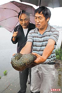 浙江省驚現「醜陋水怪」!上虞市章鎮鎮南村發現一種「水怪」,其身體在水裡呈球狀,半透明像果凍,體內還有紅色血絲,表皮布滿許多小孔。更令人驚奇的是,曾有村民拿水怪在太陽下曬,發現它竟然像冰棒似地融化。