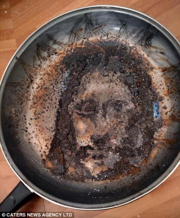 英國男子煎熏肉時鍋燒焦 鍋底驚現"耶穌像"