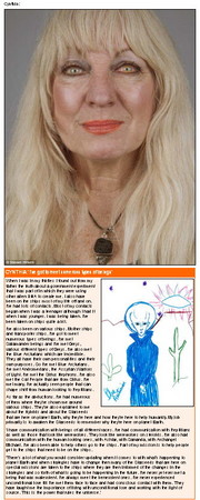 我在30多歲的時候,從我父親那兒發現有關政府實驗的真相──外星人DNA創造了部分的我。我的一生當中有許多時光生活在太空船裡。我和外星人有很多的接觸。最早開始接觸時,我才十幾歲。