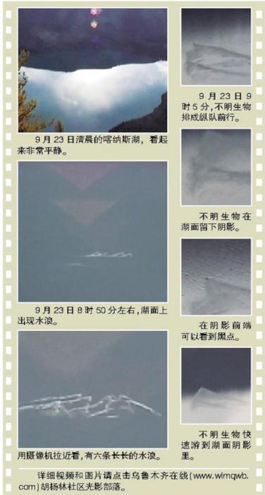 2010年5月23日10時左右喀納斯一道灣出現不明水生物,4條巨大的黑影在一道灣的湖水中時隱時現向南游動,並劃出多道大水波。
