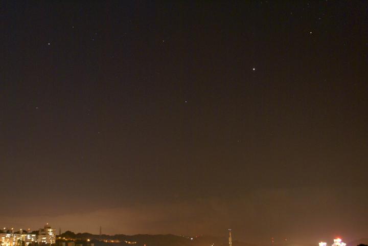 20121021@10:30:昨晚上頂樓看獵戶座流星雨,十點半看到十二點半一顆也沒看到,好奇怪!天文台說十點後每小時約有十顆,到十二點達到極大值為二、三十顆,而我家星空條件在台北應算極佳才對,怎麼整整兩個小時沒見著半顆呢?真有點失望,但這之間仍然天空四處拍了許多照,只是已經等到十二點半人也累了於是便下樓上床入眠。