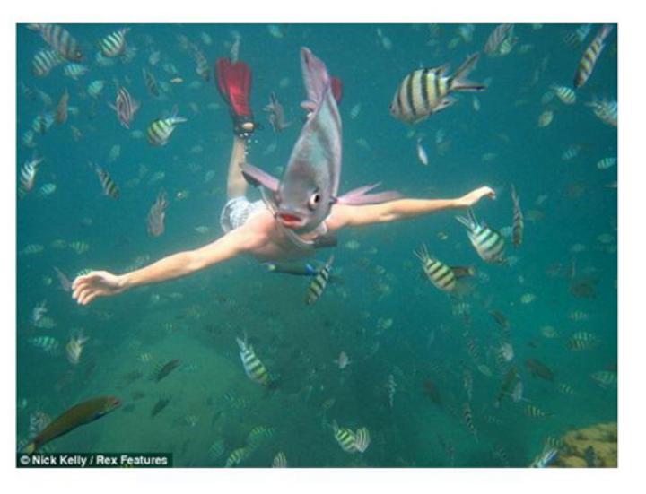 來自美國洛杉磯的Nick日前和朋友到海中浮潛時,有隻搶鏡的小魚游到朋友頭部上方,剛好被Nick的快門捕捉到,才形成這幅有趣的景象,他表示,自己當時拍攝時沒有注意這麼多,是等到上岸時看照片才發現。